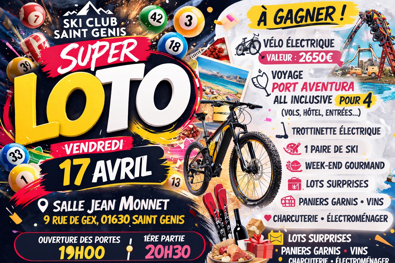 Super LOTOVendredi 17 AvrilSalle Jean Monnet9 Rue de Gex, 01630 Saint GenisOuverture des portes 19h